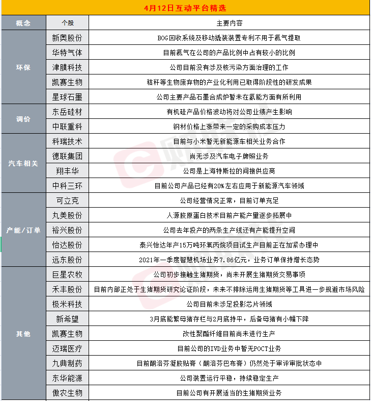 指数全天震荡下行,创业板指、深成指跌超2%,成交额有所放大,市场分化严重,个股逾3100只下跌,却有超70只个股逾9%,人气股表现活跃。板块上,前期抱团股再度成为市场重灾区,题材相对活跃,碳中和表现最强。上市公司在互动平台积极回应:可立克表示,公司经营情况正常,目前订单充足;禾丰股份表示,目前内部正处于生猪期货研究论证阶段,未来不排除运用生猪期货等工具进一步规避市场风险;迈瑞医疗表示,目前公司的IVD业务中暂无POCT业务;新奥股份表示,BOG回收系统及移动撬装装置专利不用于氦气提取。