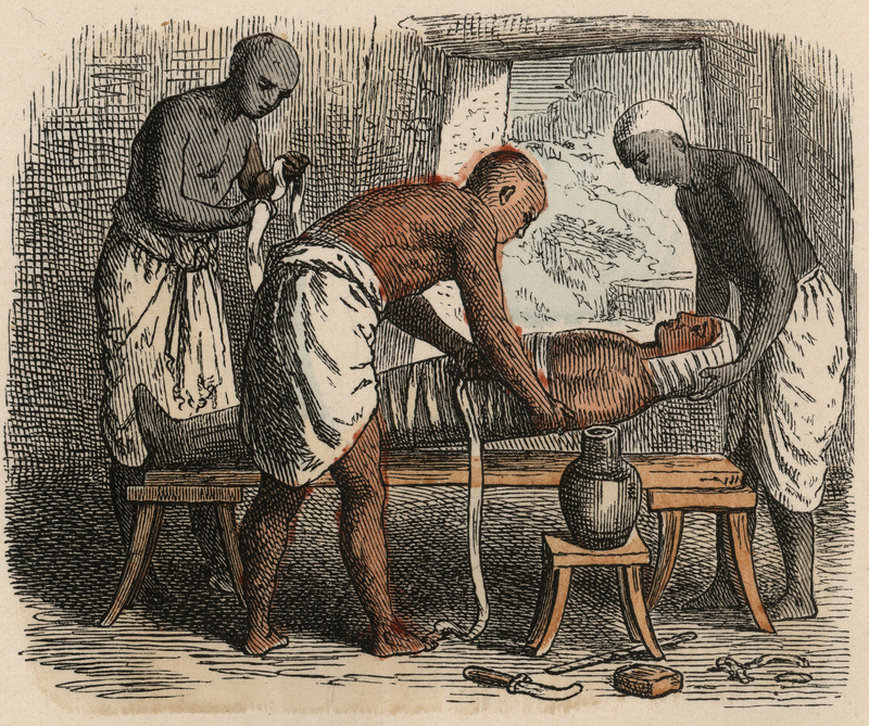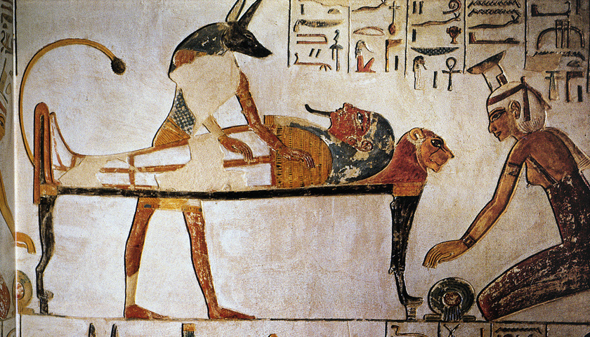 出于对死后永生的追求,古埃及人会将人的遗体以木乃伊的形式保存下来。时代不同,木乃伊的制作流程也有所变化,但核心步骤是一致的:首先,将人体内的器官取出,然后使用泡碱(一种天然盐)将人体风干,再用没药等芳香精油和树脂涂抹全身,最后用绷带封裹前,在人体内填充亚麻碎布或锯屑。