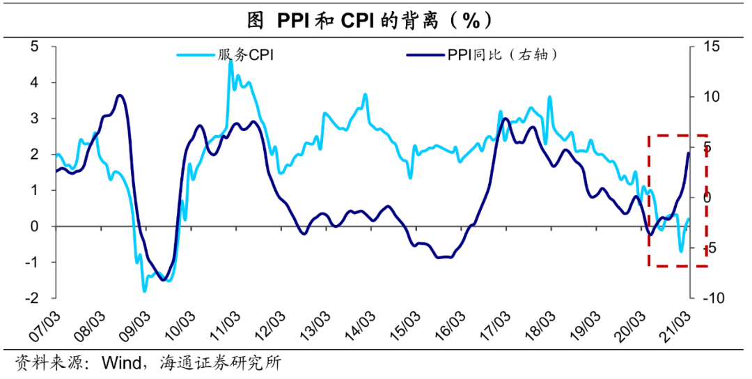 其实很难。因为以往PPI和核心CPI、服务业CPI的走势是一致的,PPI的走高代表的是经济的全面修复,而这一轮并不是这样的。去年下半年以来,尽管PPI在大幅回升,但核心CPI和服务业CPI还在下行,当前依然处于低位,服务业CPI徘徊在过去十多年的最低位置。所以本轮PPI好,仅仅代表房地产好、以及供给端的扰动,并不代表经济的全面修复。