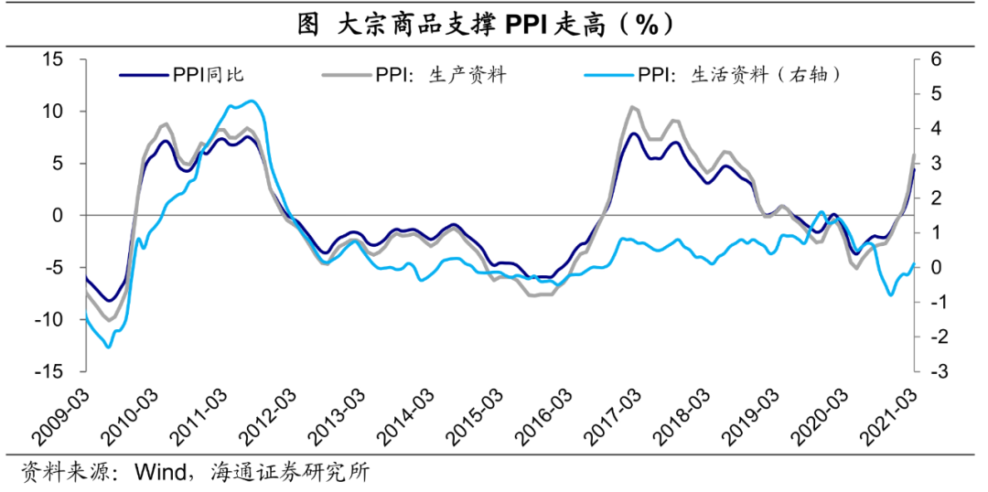 但是如果仔细拆分3月PPI的涨价结构,其实和前几个月是类似的,即PPI的回升主要是大宗商品涨价带动的,生产资料价格同比飙升到了5.8%,而生活资料价格同比仅仅转正至0.1%。