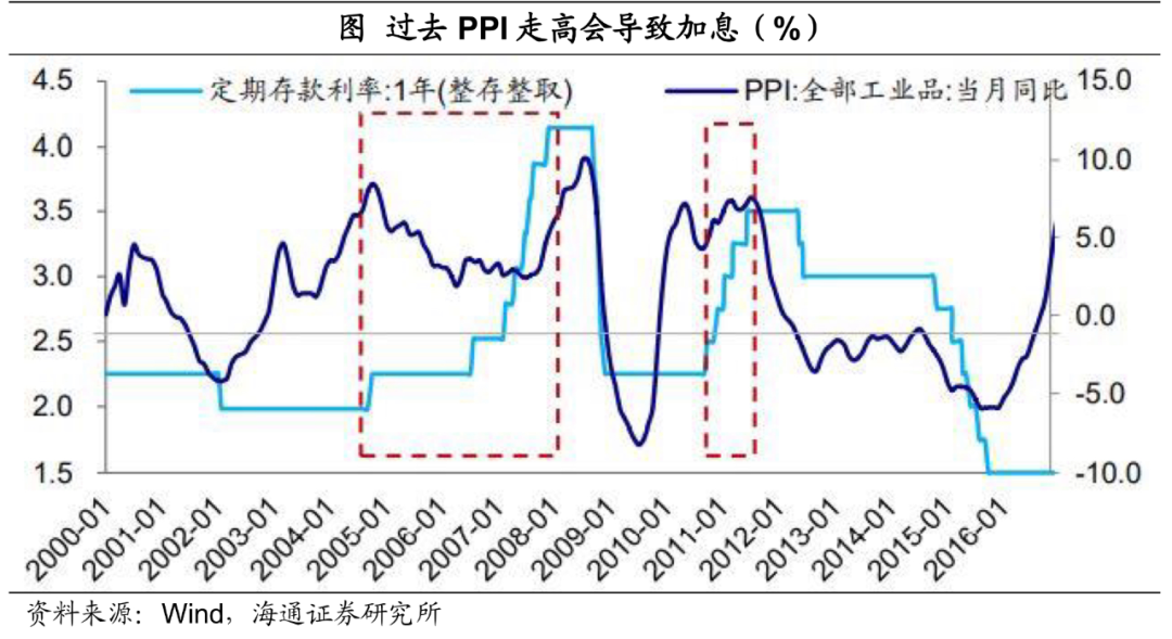 在以往的规律中,PPI的大幅走高都会导致央行的加息。今年4-5月的PPI同比会更高,会不会导致央行的加息风险呢?或者至少导致短端资金利率操作上的偏紧呢?