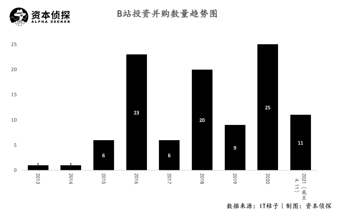 紧接着,2018年是B站发展历史中的另一个关键节点,该年3月份,B站在纳斯达克交易所成功挂牌上市,募资约30亿元人民币。手握充沛资金,B站继续在投融资市场上大展拳脚,不断通过资本力量加固自身在游戏、动画、泛二次元领域的城墙。2018至2020年,B站分别完成20、9、25笔对外融资。