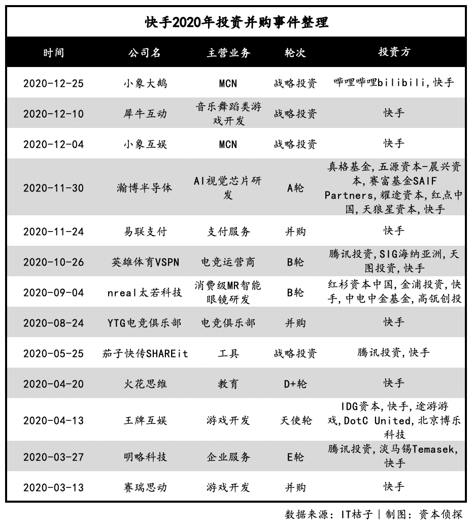 与短视频相关的娱乐内容、视频工具,是双方理所应当都会布局的方向。对此,快手收购了A站,投资了知乎、比达传媒(嘻哈文化运营)、创动空间(偶像娱乐经济)、小象大鹅(MCN)、大片(视频制作工具)。