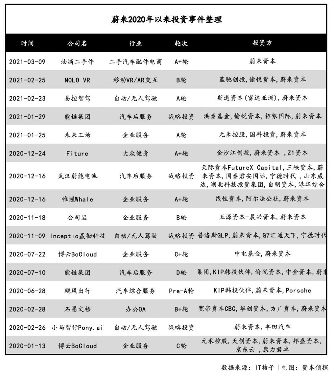 其中,着眼于高端市场的蔚来,无论造车路线、用户运营风格还是投资策略,都显得十分豪爽。蔚来本身就是新造车三剑客中融资规模最大一家,同样其也是对外投资最多的一家。