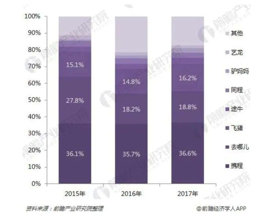 据2015年数据,同程市场份额以9.5%位列第三,2年后同程网络与艺龙旅行网合并成立新公司“同程艺龙”,腾讯与携程分别占股超20%。根据公开数据显示,2017年仅携程、去哪儿、飞猪三家企业便占据71.8%市场份额,而同程已被列入“其他”, 彼时同程旅游市场份额仅占3%。