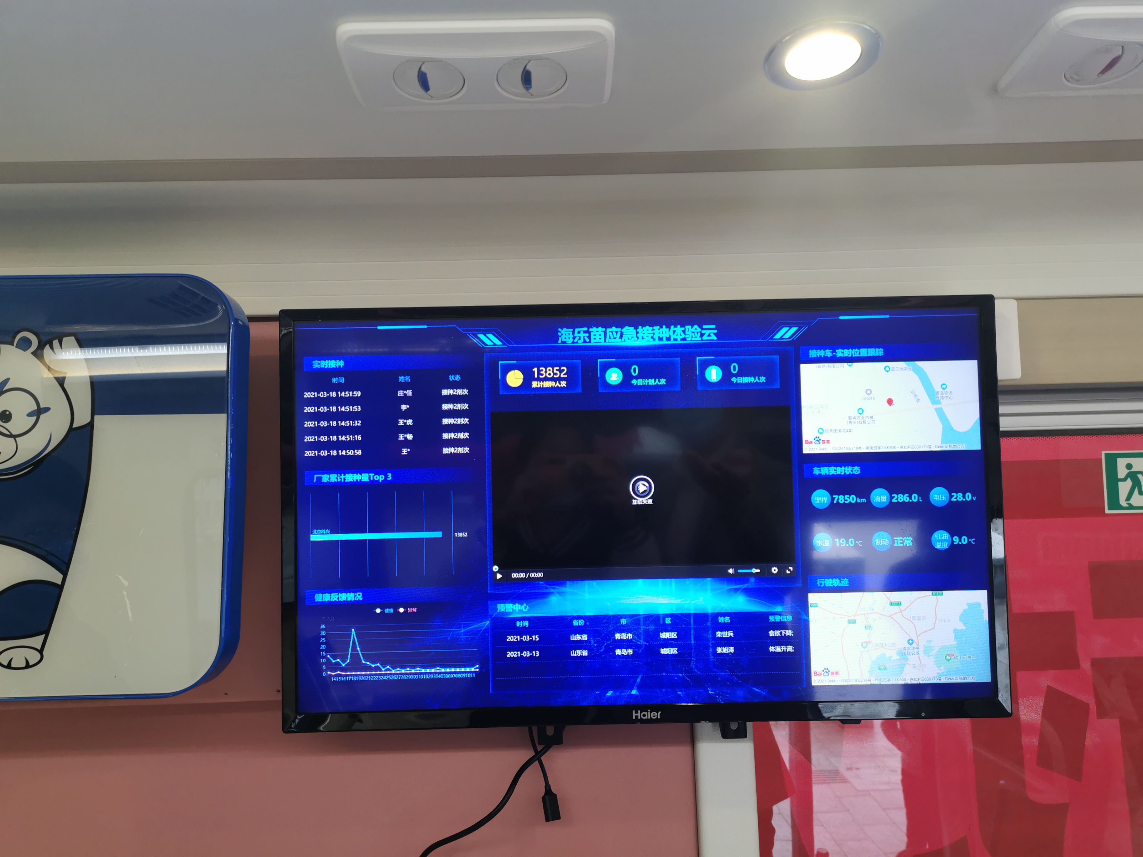 车内的信息屏显上则可实时显示出看到此辆接种车服务的总接种人次、接种疫苗信息、接种者的反馈报告以及接种车的实时地理位置等。
