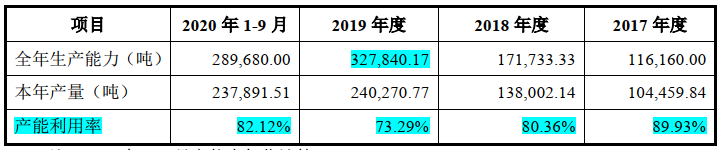 然而,想念食品上述新增的产能是否已经完全被消化了呢?据问询回复显示,2017年至2019年,其挂面的产能利用率分别为89.93%、80.36%、73.29%,呈逐年大幅下滑的趋势,甚至在2019年,其挂面的产能利用率仅约7成,2020年1-9月,虽然有所提升,但距离产能饱和还有一定的距离。