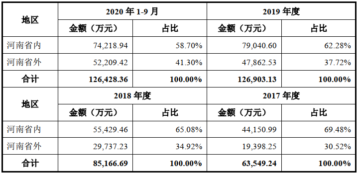新增的产能需要想念食品拥有更广阔的销售市场来消化,而想念食品目前主要销售区域集中在河南省,据问询回复显示,2017年至2020年1-9月,其河南省内的销售收入占比分别为69.48%、65.08%、62.28%、58.70%,而河南省外的销售收入占比仅为三、四成,这表明其目前的销售市场具有一定的区域局限性,因此,其品牌知名度在省外并不算高,这也会增加其省外市场推广的难度。