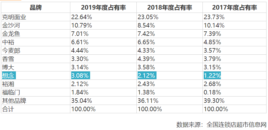 另外,据全国连锁店超市信息网显示,目前全国连锁店的占有率位居第一的为克明面业,占有率在20%以上,而2017年至2019年,想念食品的占有率分别为1.22%、2.12%、3.08%,处于偏低的水平,且并不在前五名之列。而全国连锁超市销售渠道是想念食品向全国市场扩张的关键方式,其在此处存在的短板,恐怕也将限制其全国市场的开拓。