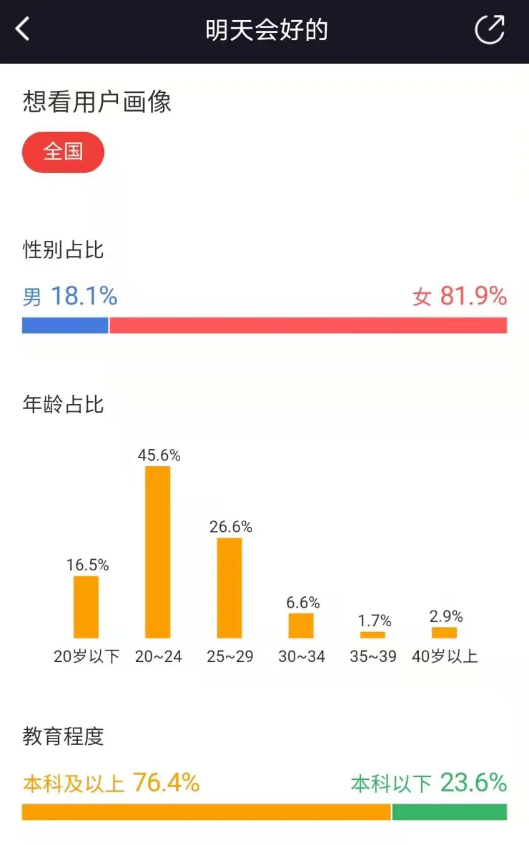 猫眼的用户画像中,《明天会好的》想看用户,女性占81.9%,30岁以下的人占88.7%,四线城市关注度高达47.3%。