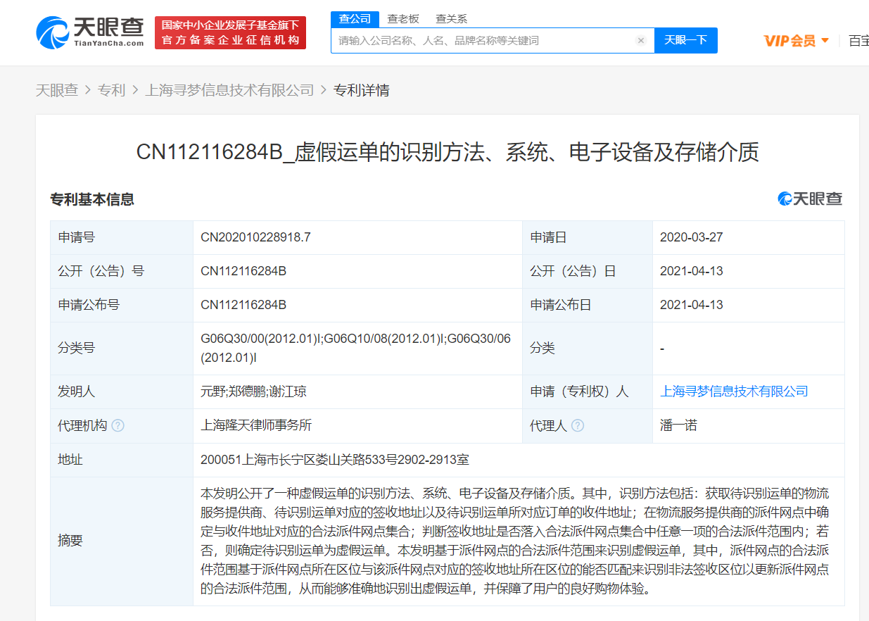 据天眼查APP显示,4月13日,拼多多关联公司上海寻梦信息技术有限公司公开一项名为“虚假运单的识别方法、系统、电子设备及存储介质”的发明专利,公开号为CN112116284B,申请日为2020年3月。