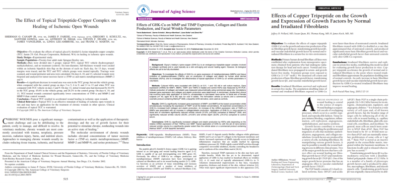 也有众多研究证明,蓝铜胜肽具备较好的抗炎和修复功效。比如,2003年,佛罗里达大学伤口研究所的Canapp等人研究发现,局部使用蓝铜胜肽凝胶可以通过降低急性炎性细胞因子的水平,抑制炎症反应, 改善缺血性伤口愈合。2005年,斯坦福大学医学中心的Pollard 等人用蓝铜胜肽治疗辐射后的成纤维细胞,发现蓝铜胜肽可促进辐射后成纤维细胞的正常生长,且与正常细胞生长的数量倍增时间近似相同。