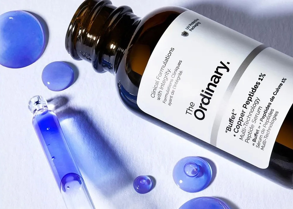 DECIEM公司旗下的另一个以平价著称的的功效护肤品牌The ordinary,也推出了含有蓝铜胜肽的Buffet Copper Peptides 抗老修复精华,该产品中添加了1%蓝铜胜肽,价格在260元/40ml左右,比The ordinary旗下其他多肽复合精华足足贵了一倍。此外,这个产品中还含有乙酰基六肽-8、棕榈酰四肽-7、棕榈酰三肽-1等多肽成分以及透明质酸复合物,主要发挥抗老修复和保湿的功效。