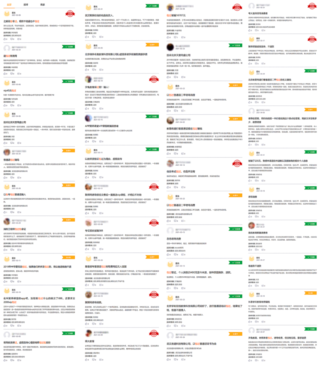 黑猫投诉平台显示,仅2021年3月1日至今,关于包过班的退费投诉就不下百起。其中,被投诉的机构包括以聚师网、师大教育在内的教师资格考试培训机构;还有以言道科技、教易有道在内的普通话等级测试培训机构;以及以驾考宝典为代表的驾考培训机构;还有天普、中宇博学教育在内的消防工程师资格考试培训机构。