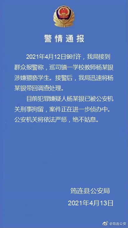 四川省宜宾市筠连县公安局官方微博4月13日通报,4月12日9时许,该局接到群众报警称,巡司镇一学校教师杨某银涉嫌猥亵学生。接警后,筠连县公安局迅速将杨某银带回调查处理。目前犯罪嫌疑人杨某银已被公安机关刑事拘留,案件正在进一步侦办中。公安机关将依法严惩,绝不姑息。