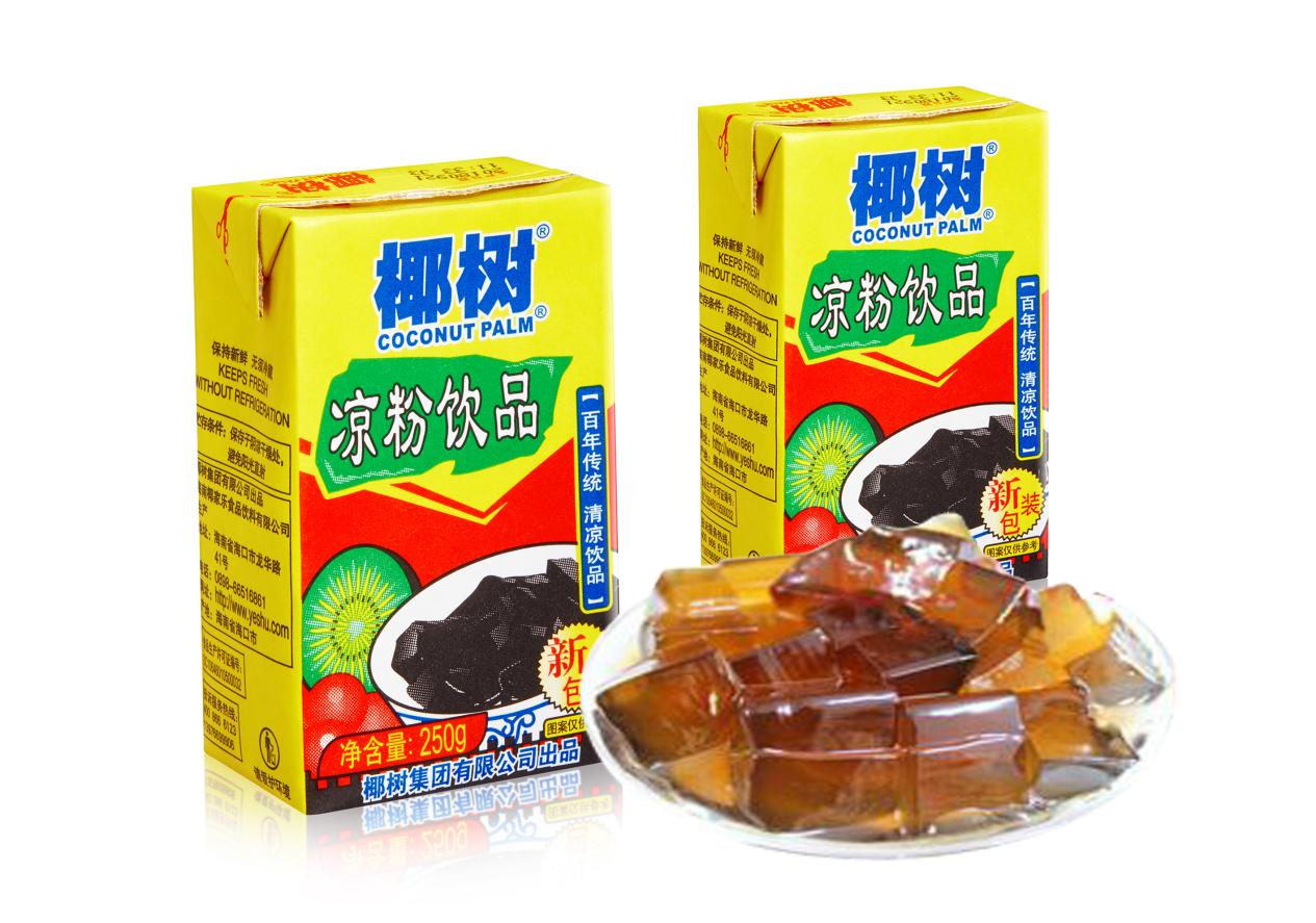 凉粉是两广地区的有名小吃,又称仙草。椰树在老配方的基础上对凉粉做了改良,以凉粉草蒸煮液为基本原料,加入白糖、蜂蜜等原料,经科学工艺方法加工而成。椰树凉粉内含多糖、卡拉胶、少量果胶及多种对人体有益的微量元素,具有清热解暑等功效。