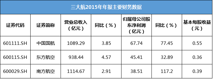 3月30日晚间,三大航齐齐发布2015年年报,年报显示,中国国航(601111.SH)、东方航空(600115.SH)、南方航空(600029.SH)2015年实现归属母公司股东净利润分别为67.74亿元、45.41亿元、38.51亿元;汇兑损失分别为51.56亿元、49.87亿元、57.02亿元。
