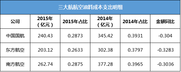 以中国国航为例,公司航空油料成本在2014年占总比例比例过39.31%,而2015年即降至28.73%,成本占比减少的同时,航油成本金额也下降30.40%。东方航空和南方航空同样如此。
