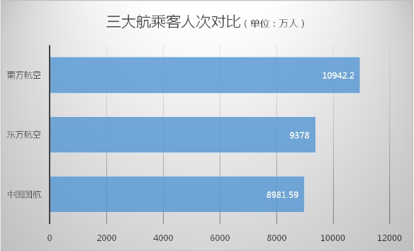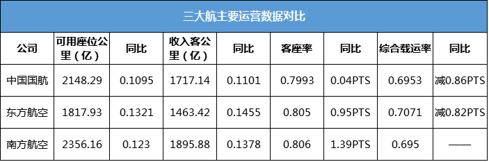 客运供需均增加,但客座利用率方面,三大航依然有所提升,南方航空提升幅度最大,上升了1.39个百分点至80.50%。