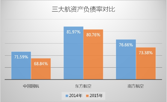 不过在2015年三大航资产负债率均有所下降。截至2015年12月31日,中国国航的资产负债比率为68.84%,较2014年底的71.59%降低了2.75 个百分点。南方航空下降了3.28个百分点至73.38%。