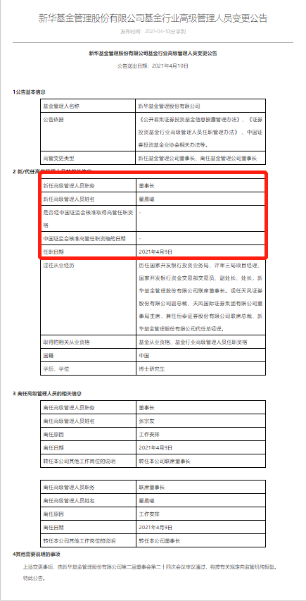4月9日,新华基金公告,翟晨曦从公司联席董事长新聘任为董事长,原董事长张宗友转任联席董事长。2020年3月,随着天风证券收购恒泰证券股权被证监会核准,翟晨曦也从天风证券“空降”新华基金,任新华基金联席董事长。