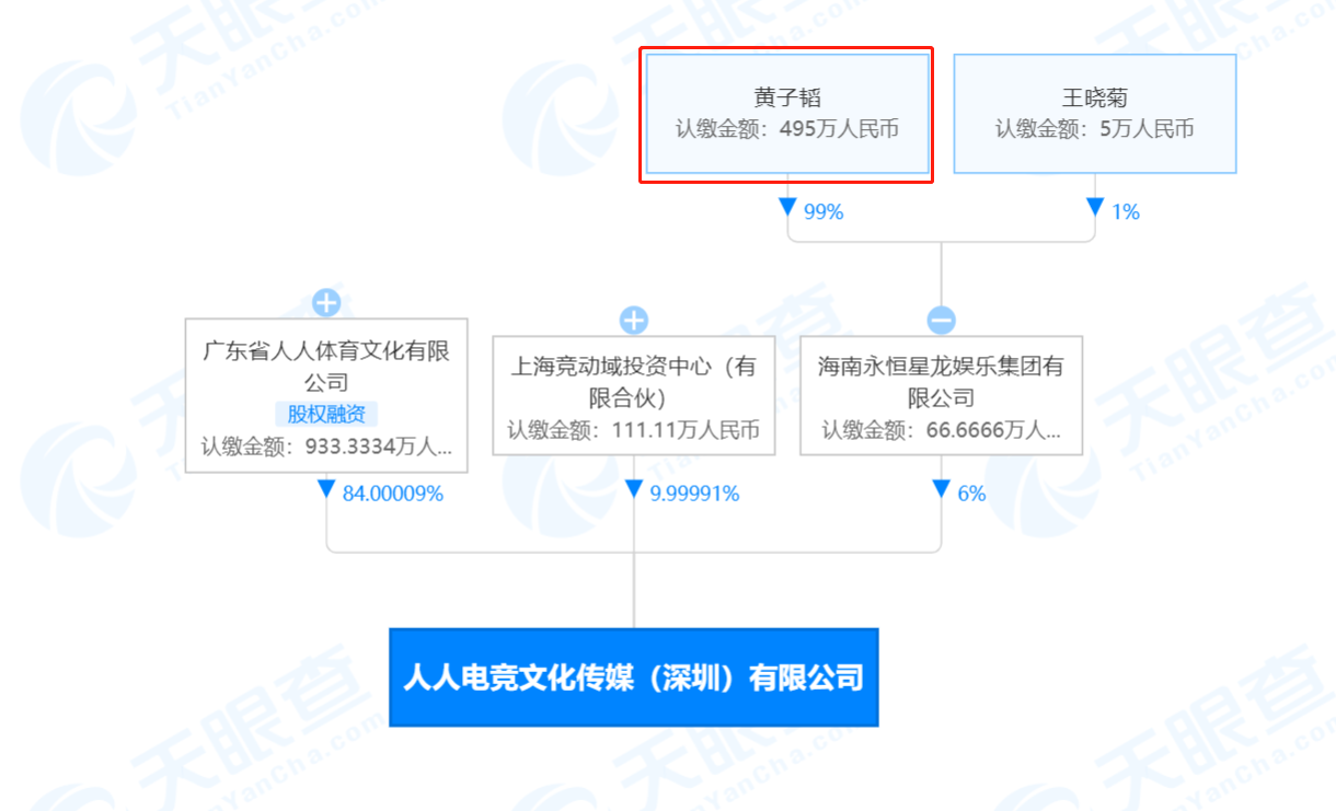 据天眼查APP显示,4月13日,人人电竞文化传媒(深圳)有限公司发生工商变更,股东新增海南永恒星龙娱乐集团有限公司,后者最大股东为黄子韬,持股比例99%。
