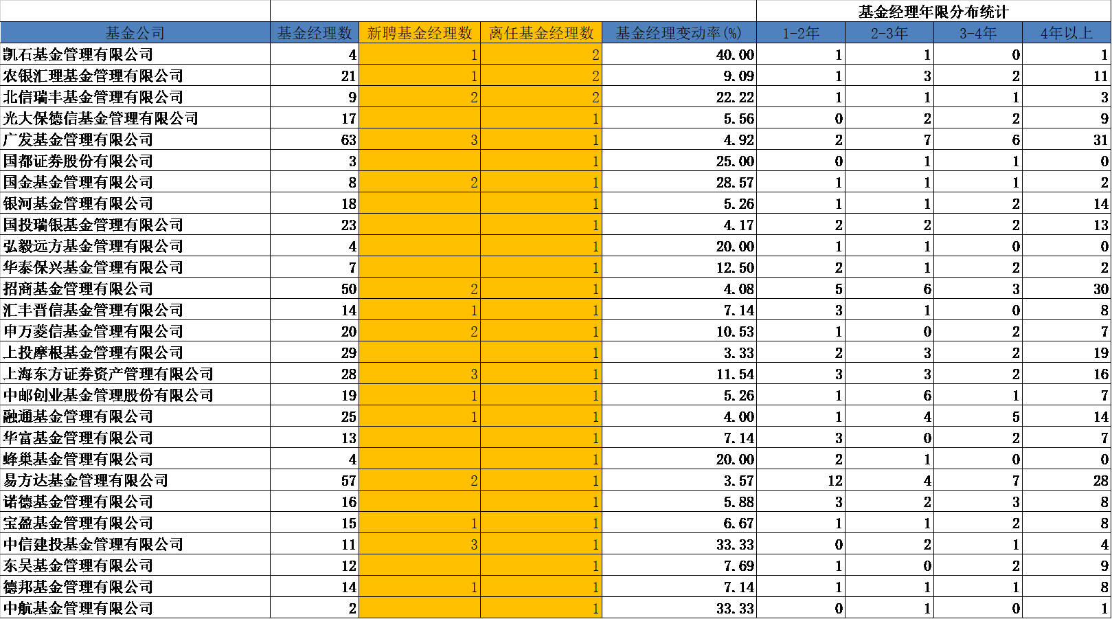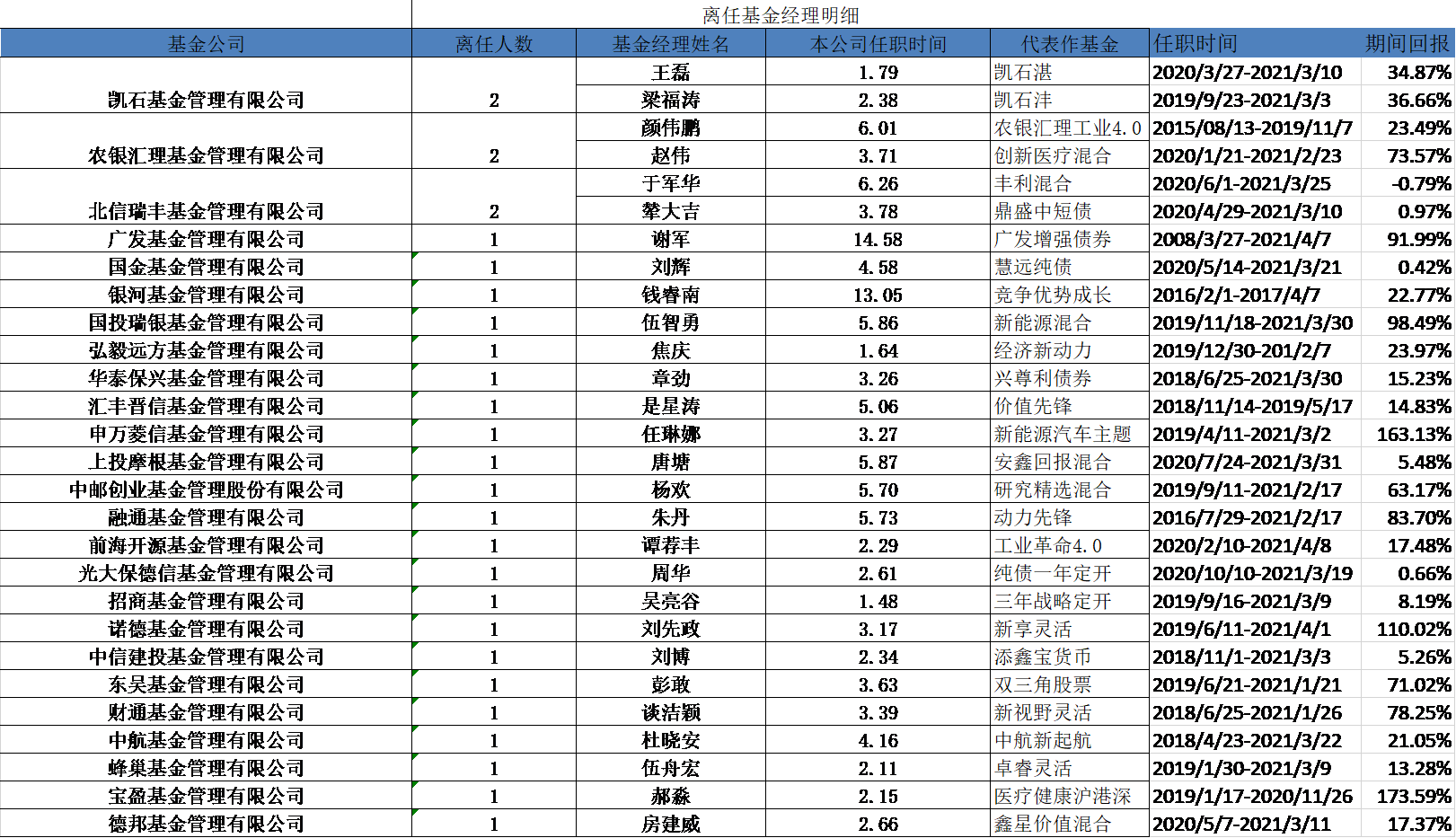 数据显示,进入3月份以来离任的基金经理多集中在中小型公募。其中,凯石基金、农银汇理、北信瑞丰等三家公司均有2位基金经理离任。