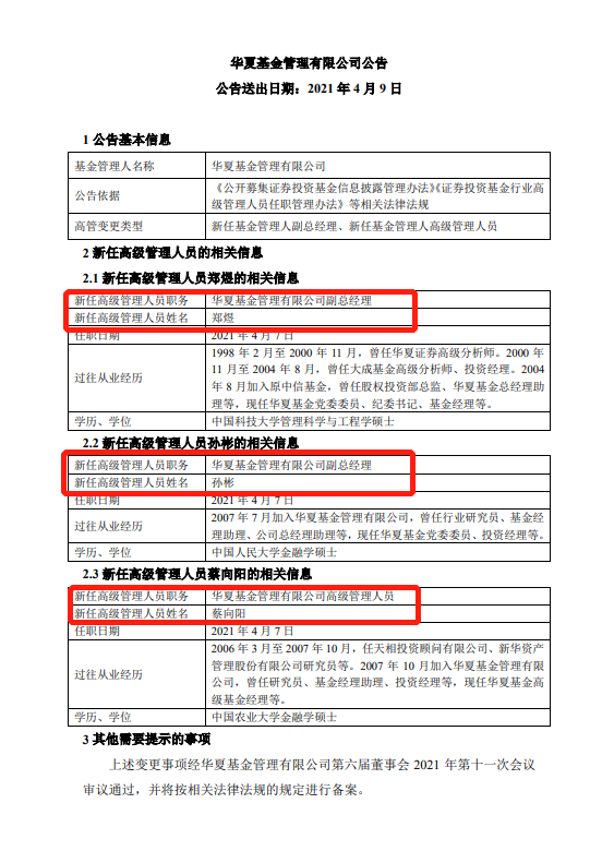 华夏基金4月9日公告,郑煜、孙彬、蔡向阳三位基金经理实现晋升。其中,郑煜、孙彬均晋升为公司副总经理。