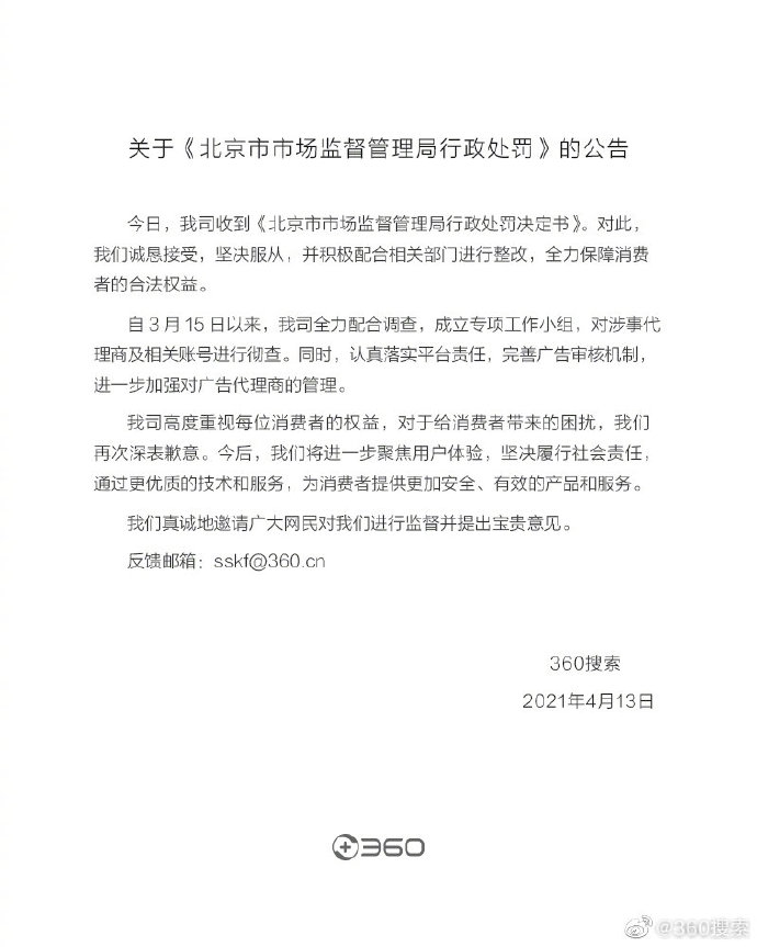 4月13日下午,360搜索在其官方微博发布公告称:“今日,我司收到《北京市市场监督管理局行政处罚决定书》。对此,我们诚恳接受,坚决服从,并积极配合相关部门进行整改,全力保障消费者的合法权益。”
