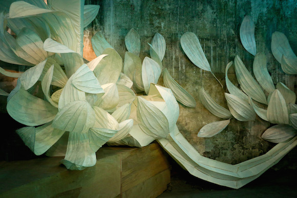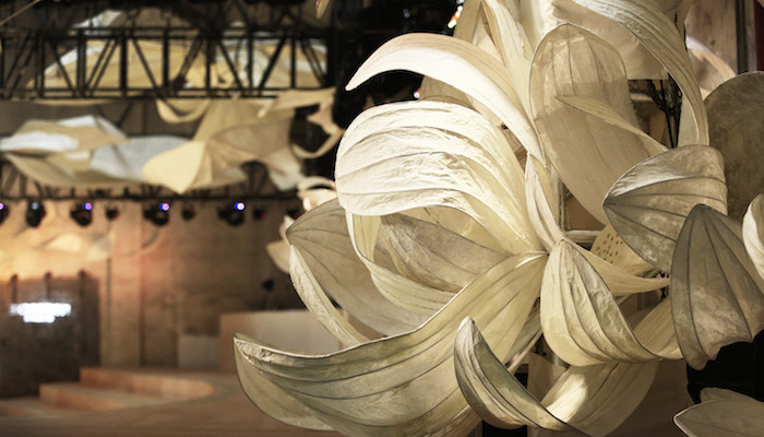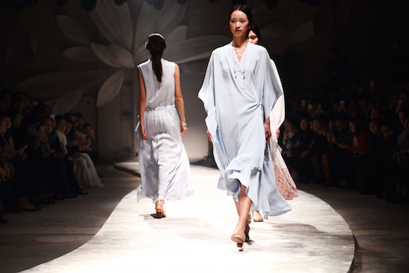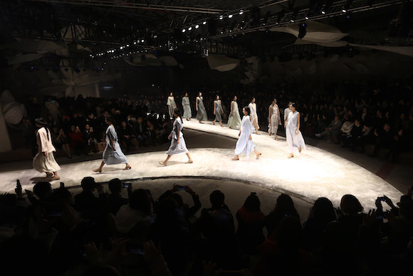 灯光暗下,干冰漫出,孩童伴着投影朗诵陆游的七言律诗《采莲曲》。覆盖在秀台之上的,是画上了水墨画的宣纸。而秀场内的悬挂之物,则是用浆过宣纸制成的大片莲花瓣。如果没有足够的财力,是负担不起这些所费不菲的布置的。