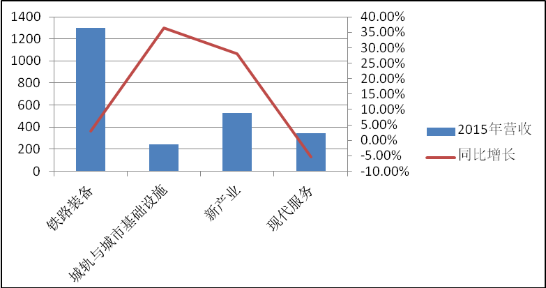 其中:铁路装备营业收入为1301.99亿元,同比增加2.99%;城轨与城市基础设施营业收入为246.13亿元,同比增加36.31%;新产业营业收入为529.21亿元,同比增加27.98%;现代服务营业收入为341.8亿元,同比减少5.45%。公司的新产业业务以风电装备、新材料、新能源汽车以及环保装备为重点,而现代服务业以金融、类金融和物流服务为重点。