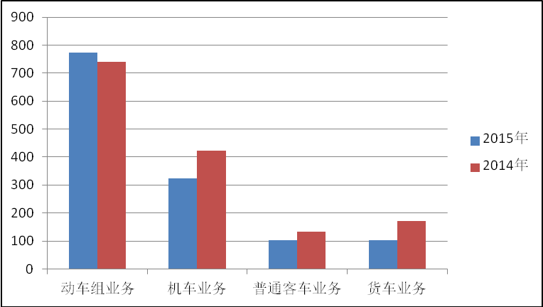 拆分铁路装备业务的收入构成,其中动车组营业收入772.48亿元,这也是中国中车铁路装备业务中仅有的销量取得增长的板块;其余机车业务收入324.92亿元、普通客车收入102.79亿元、货车收入101.78亿元,较2014年分别下降23.02%、40.77%以及22.43%。