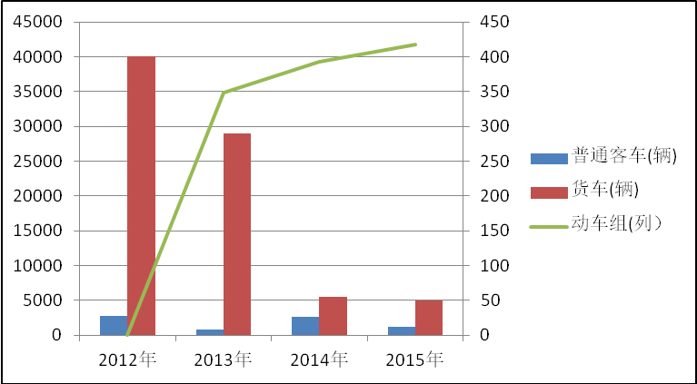 中国铁路总公司对外货车招标采购数量自2012年的4万辆持续下滑至2015年的0.5万辆,普通客车也自2012年的2700辆下滑至2015年的1143辆,采购收窄幅度相当明显。而随着货车和普通客车的减少,牵引机车的订单必然也会按比例减少(受“温州723”动车事故影响,2012年无动车组招标)。