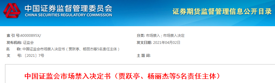 4月13日,证监会官网披露《中国证监会市场禁入决定书(贾跃亭、杨丽杰等5名责任主体)》。据此,鉴于乐视网3(400084.OC) 实际控制人,时任乐视网董事长贾跃亭、时任乐视网财务总监杨丽杰违法情节特别严重,依据《证券法》和《证券市场禁入规定》规定,证监会决定:对贾跃亭、杨丽杰采取终身证券市场禁入措施。