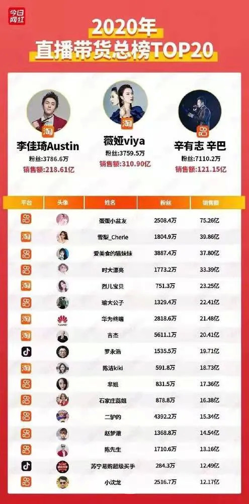 根据今日网红数据,2020年薇娅、李佳琦、辛巴分别带货310.9亿、218.61亿、121.15亿,而罗永浩带货19.71亿,排在第12名。在第三名之后,还有中间雪梨、蛋蛋、猫妹妹等一大批中头部主播夹在中间。