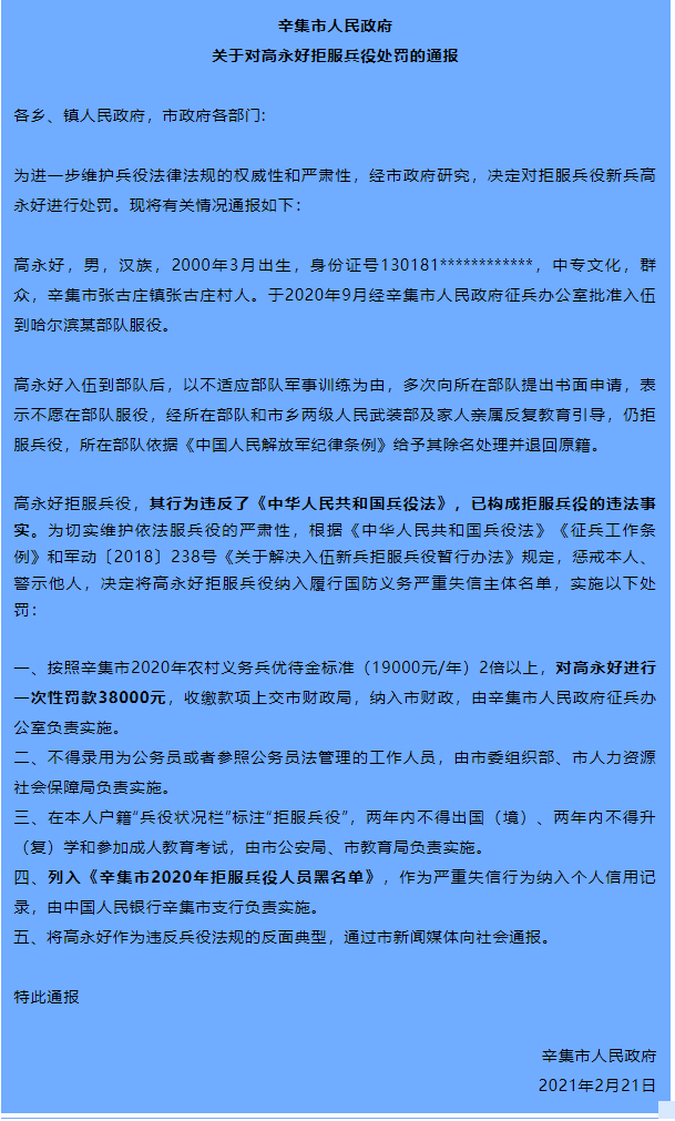 通报显示,高永好拒服兵役,其行为违反了《中华人民共和国兵役法》,已构成拒服兵役的违法事实。按照辛集市2020年农村义务兵优待金标准(19000元/年)2倍以上,对高永好进行一次性罚款38000元,列入《辛集市2020年拒服兵役人员黑名单》,作为严重失信行为纳入个人信用记录。