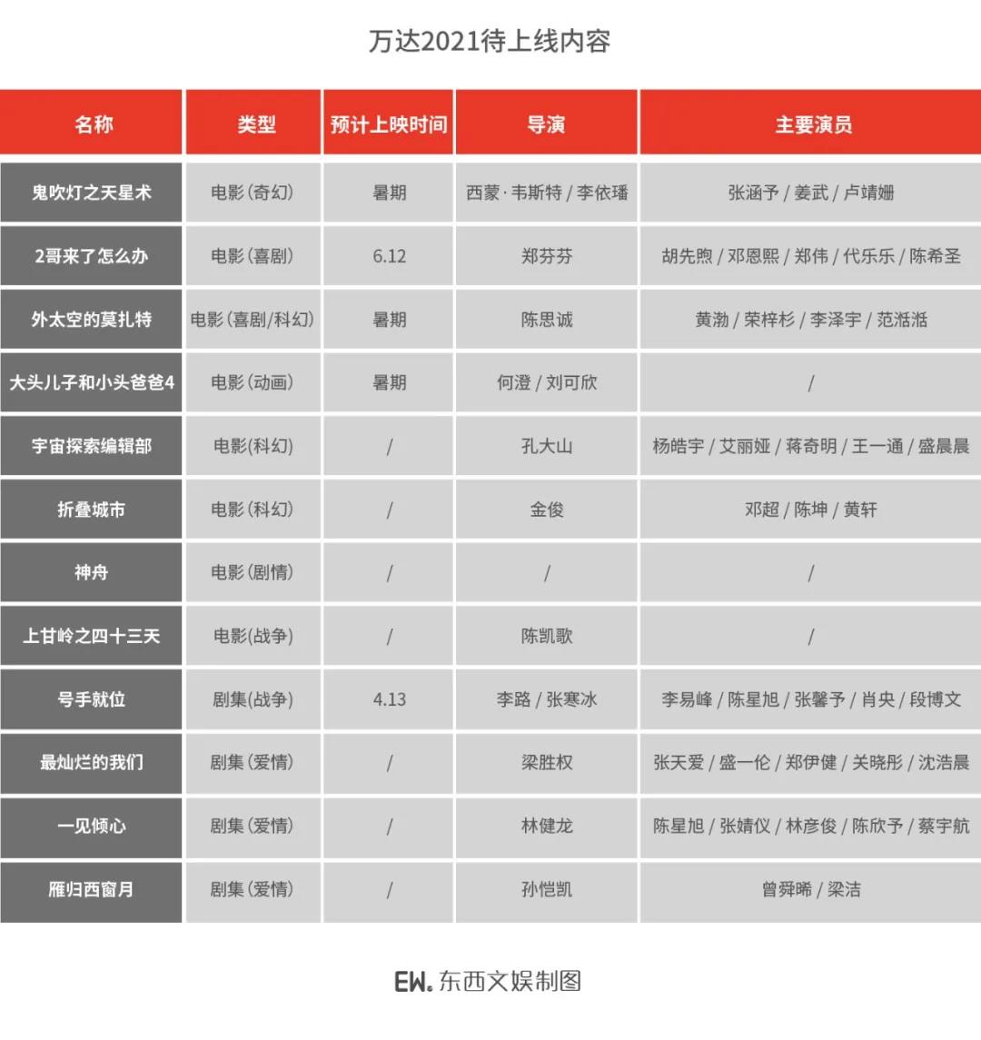 在市场大盘之外,万达电影自身在2021年内容储备也相对丰富,一是新拍摄的电影即将上线,二是此前受疫情影响未能在2020年如期上映的部分电影,也将在今年陆续上映。