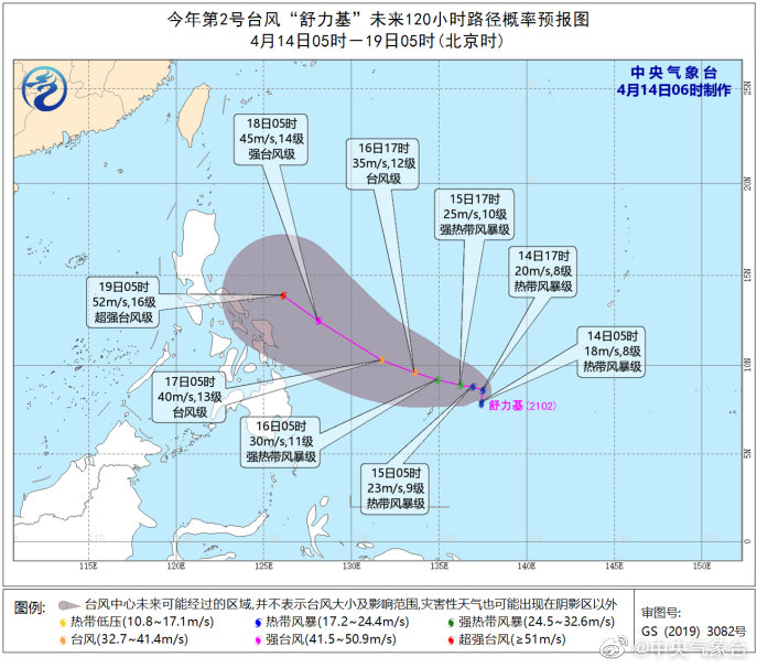 据中央气象台消息,今年第2号台风“舒力基”(热带风暴级;英文名称:Surigae;名字来源:朝鲜;名称意义:一种鹰)已于今天(4月14日)凌晨在菲律宾以东洋面生成,未来三天“舒力基”对我国海区无影响。早晨5点钟其中心位于菲律宾马尼拉东偏南方约1940公里的洋面上,中心附近最大风力有8级(18米/秒),中心最低气压998百帕。