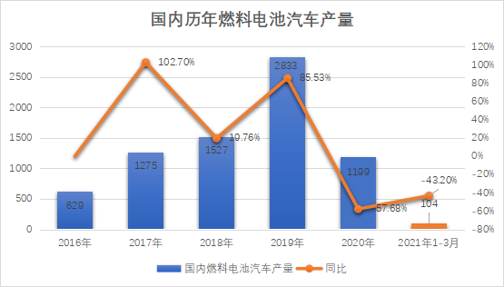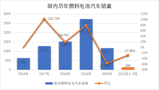 根据中汽协数据显示,今年1-3月,我国汽车产销分别完成635.2万辆和648.4万辆,同比分别增长81.7%和75.6%,其中新能源汽车产销分别完成53.3万辆和51.5万辆,同比分别增长3.2倍和2.8倍,可见无论是汽车整体还是新能源汽车细分领域,均收获了2021的新年“开门红”。反观燃料电池汽车,全国1-3月产销却分别只完成了104辆和150辆,同比分别下降43.2%和27.6%。