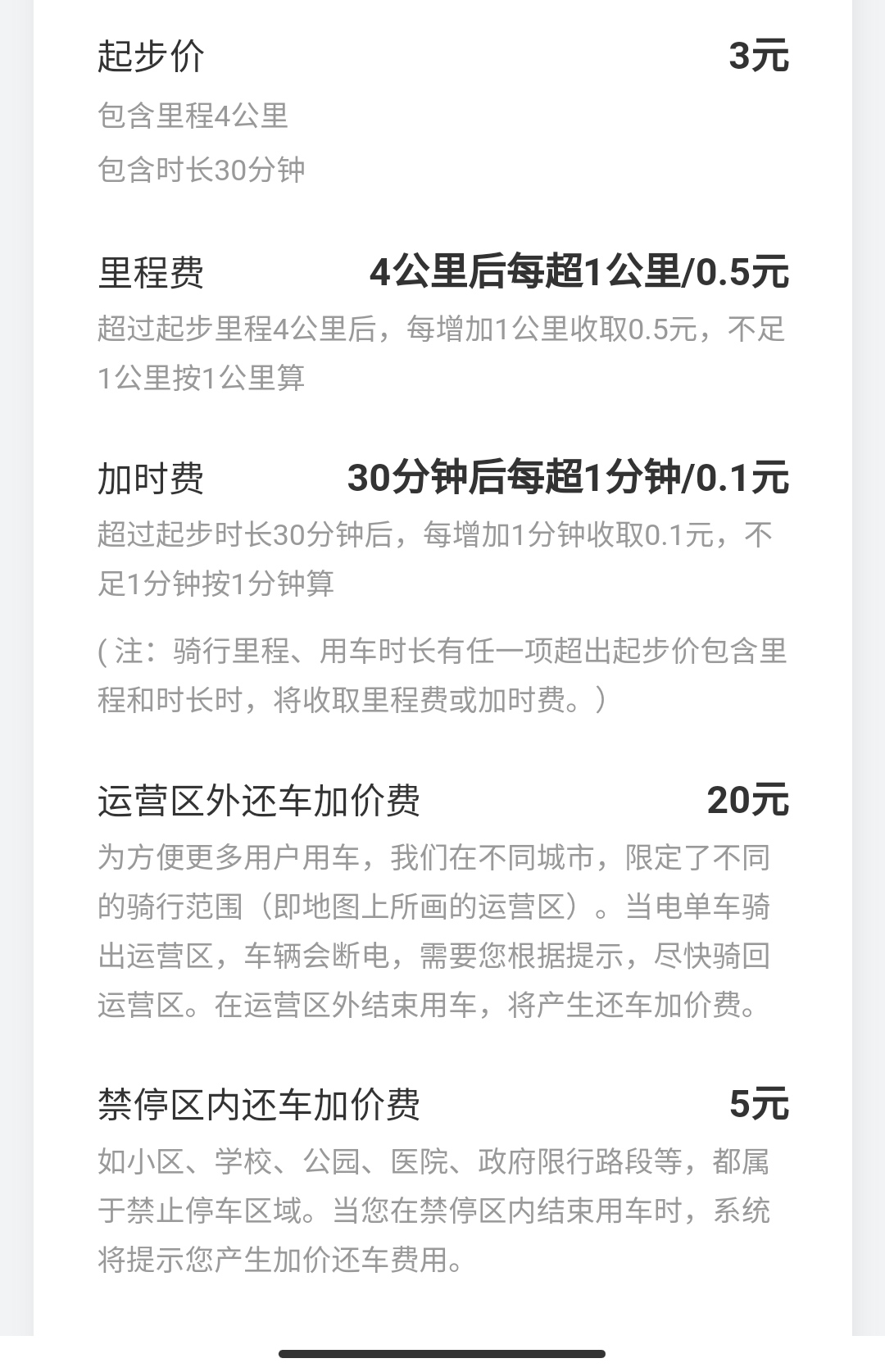 连线出行通过松果出行APP可以看到,其共享电单车的费用为30分钟/4公里内骑行为3元,4公里之后每超1公里收取0.5元;30分钟后每超一分钟收取0.1元。