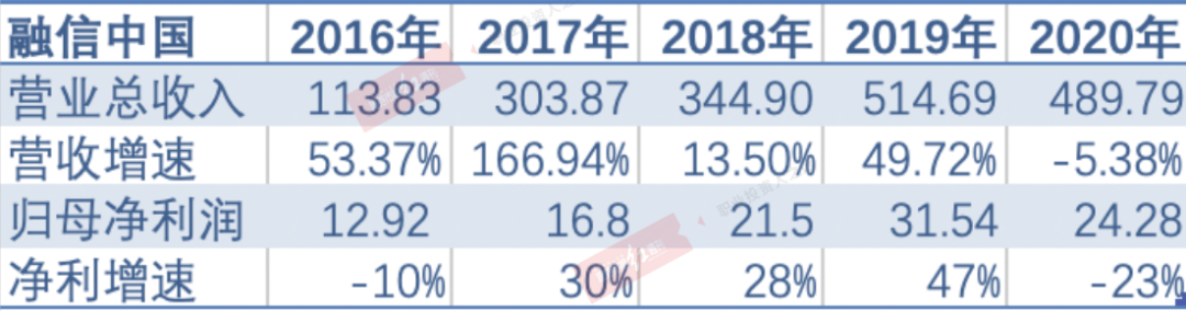表1 2016-2020年融信中国营收净利变化;数据来源:Wind