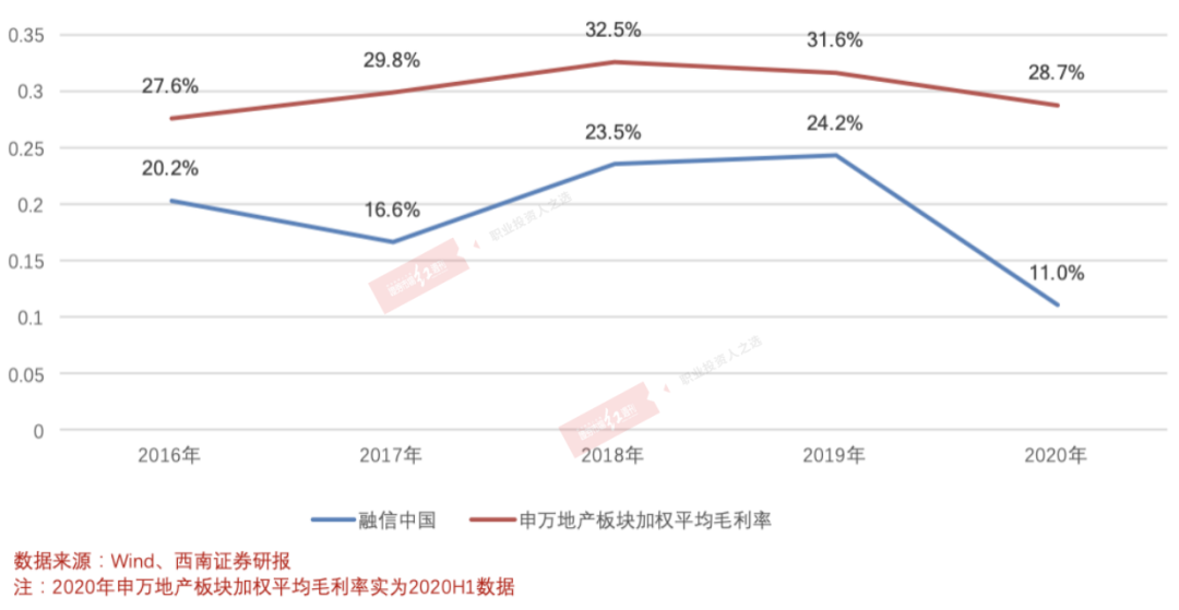 虽然近年来房企毛利率有呈现下滑的趋势,但近5年来(2016-2020年)平均水平也维持在30%上下,远高于融信中国20%的平均水平。 (见图1)
