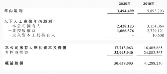 2020年,融信中国权益总额为506.59亿元,其中,公司拥有人应占资本和储备177.13亿元,占比34.96%;非控股权益329.46亿元,占比65.03%。而在净利润方面,2020年融信中国实现净利润34.95亿元,其中公司拥有人应占净利润为24.28亿元,占比69.47%,非控股权益应占净利润为10.66亿元,占比30.5%。在权益总额中占比超6成的非控股公司却只分得了3成净利润。(见图3)