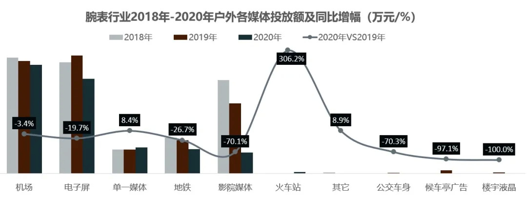 受制于新冠疫情影响,2020年全年腕表行业户外广告整体投放有所下滑。但纵观近3年的户外媒体投放趋势,机场媒体、电子屏媒体仍然是腕表行业最为核心的2大媒体选择。