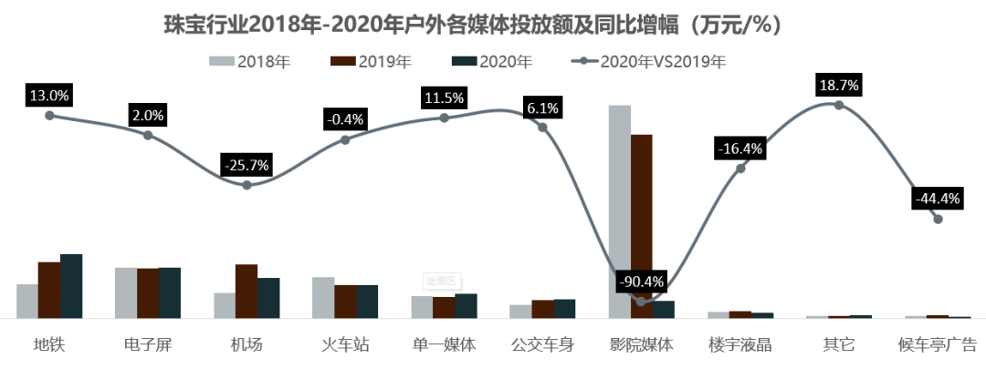 从近3年的户外媒体投放趋势来看,地铁媒体、电子屏媒体、机场媒体是珠宝行业最为核心的3大媒体选择。