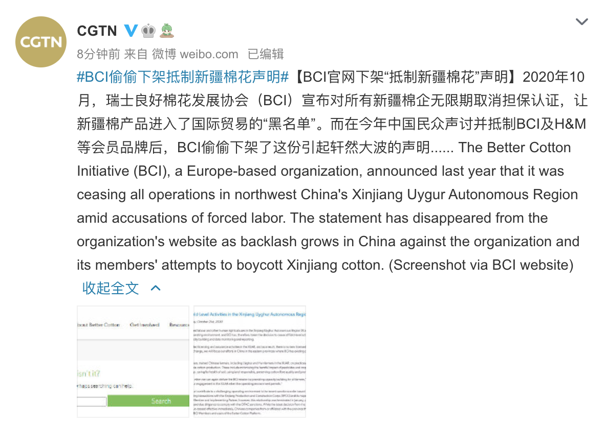据@CGTN 微博4月15日消息,2020年10月,瑞士良好棉花发展协会(BCI)宣布对所有新疆棉企无限期取消担保认证,让新疆棉产品进入了国际贸易的“黑名单”。而在今年中国民众声讨并抵制BCI及H&M等会员品牌后,BCI偷偷下架了这份引起轩然大波的声明。