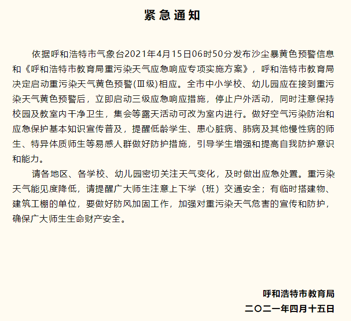 据“呼和浩特教育”微信公众号消息,依据呼和浩特市气象台2021年4月15日06时50分发布沙尘暴黄色预警信息和《呼和浩特市教育局重污染天气应急响应专项实施方案》,呼和浩特市教育局决定启动重污染天气黄色预警(Ⅲ级)响应。全市中小学校、幼儿园应在接到重污染天气黄色预警后,立即启动三级应急响应措施,停止户外活动,同时注意保持校园及教室内干净卫生,集会等露天活动可改为室内进行。做好空气污染防治和应急保护基本知识宣传普及,提醒低龄学生、患心脏病、肺病及其他慢性病的师生、特异体质师生等易感人群做好防护措施,引导学生增强和提高自我防护意识和能力。