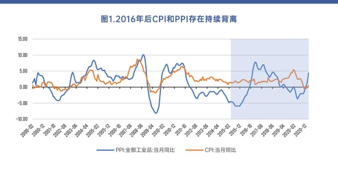 这种背离并不是新现象。2016年之后,PPI与CPI就一直存在持续背离(图1)。这至少说明,过去五年里,并没有看到PPI能够向CPI传导的有效证据,从生产端向消费端的价格传导机制并不顺畅。