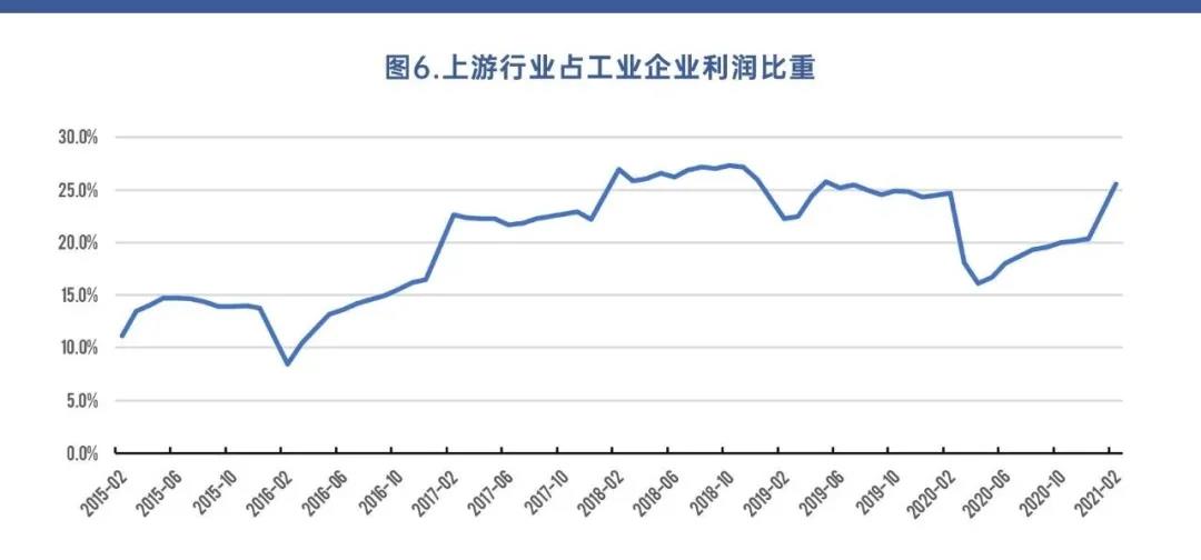 如前所述,在过去五年里PPI和CPI持续存在背离,且看不到PPI向CPI传导的历史证据。此时,大宗商品价格上涨主要体现为产业链上下游利润的再分配,即上游行业占总体利润的比例越来越高。