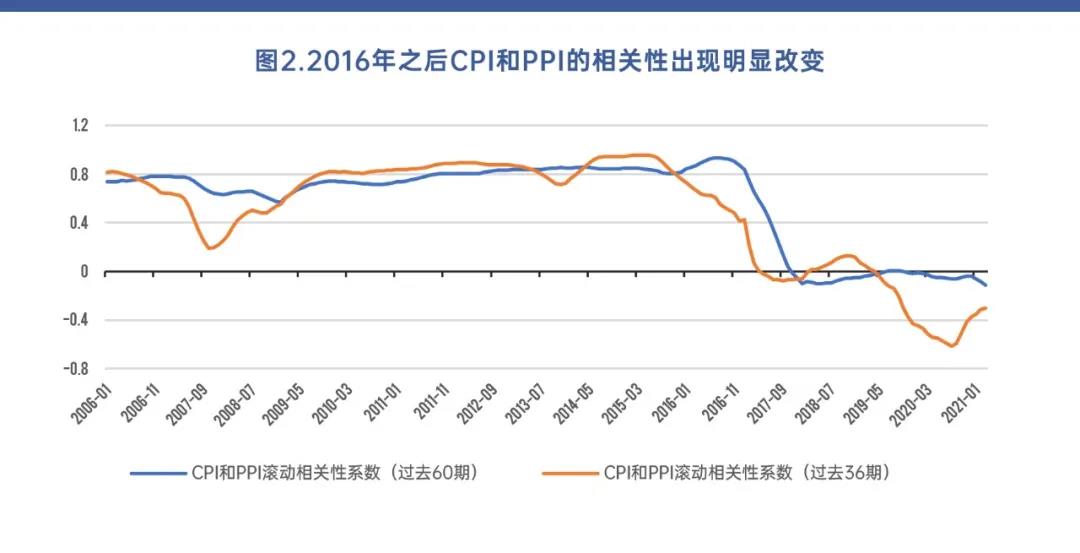我们计算了不同周期下CPI和PPI的滚动相关系数,结果表明,PPI和CPI的相关性在2016年前后出现了很大的结构性变化。如图2所示,2016年之前,PPI和CPI的当期滚动相关性比较稳定,除了2008年金融危机期间,3年期和5年期滚动相关性均在0.8左右。但2016年之后,3年期滚动相关系数快速下降,随后是5年期滚动相关系数在2017年快速下降。